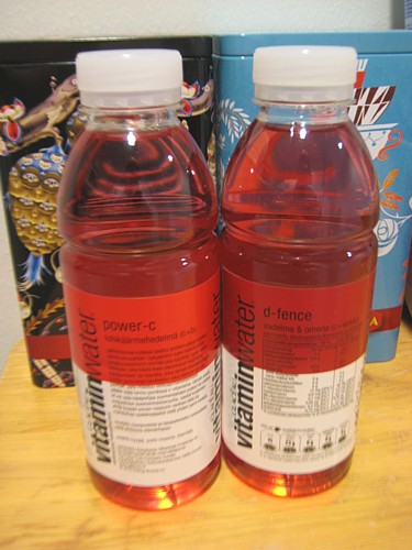 Keskustorilla oli (sillon joskus) rekka mainostamassa näitä vitamiinivesiä. Tyttö jutteli kovaääniseen ja kansa pyöritti onnenpyörää joka kertoi minkä väristä vettä sai, parissa sakarassa oli kaksi valinnaista pulloa. Jonoa oli kohtalaisesti, mutta onneksi se liikkui reippaasti. Jo jonossa pohdin taktiikkaa millä saisin kaksi pulloa...ja helppoahan se oli, hieman antoi vauhtia, mutta ei liikaa, naps, kaksi valinnaista. Valitsin lohikäärmehedelmän ja vadelma-omenan. Ihan ok, en ostaisi sillä hinnalla mikä kaupassa näyttää olevan, mutta tokihan ilmaiseksi.