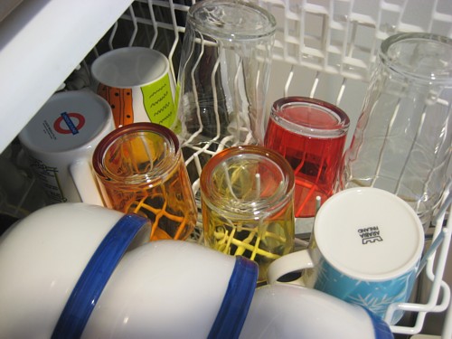 Tänään odotti myös tiskikone tyhjennystä. Tiskikone on meillä minun hommani ja se onkin minusta kotitöistä mukavin. Nuo värikkäät lasit ostin kesällä ja on niistä pitänytkin ottaa kuva, ovat niin pirteät ja kauniit. Itse en niitä hirveästi käytä kun juon veteni lasituopista, mutta pikkusisko käyttää normilaseja.