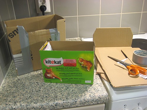 Siitä se idea sitten lähti, niksi-seasta päivää. Eli askartelin pahvilaatikosta saksien ja ilmastointiteipin (maailman kätevin tuote) avulla roskisvaunuun sopivan boksin! Huomasin jo vuosia sitten miten täydellinen kolo roska-astian taakse jää roskavaunuissa, märkäruokaboksi oli siihen täydellisen kokoinen, mutta niin on pienellä vaivannäöllä zooplussakin. Miksiköhän noihin vaunuihin muuten on suunniteltu tuommoinen tyhjä tila? Ilman boksia roska-astia lentelee vaunussa ees taas. Joku insinööri kenties vauhdissa?