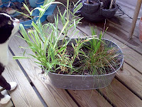 Viimeisenä Annin viiruhelpi (tuli taimena) ja läheisestä metsästä juurineen revitty juolavehnä. Juolavehnä otti hieman itseensä kun sen revin ja kuivahti lähes kokonaan. Mutta nyt se on alkanut puskemaan vihreää kunnolla. Viiruhelpi on voinut hyvin koko ajan, mitä nyt vähän kärsi alussa kun Anni söi kasvia nopeammin kun kasvoi uutta lehteä tilalle. :D Mutta kun olimme maalla viikon sai viiruhelpi kasvaa kunnolla ja nyt riittää taas purtavaa, etenkin kun juolavehnäkin tarjoaa nyt syömistä. Tästä riittää Annille koko syksyksi ja kylmien tultua ajattelin siirtää tuon sisälle. Katsotaan kauanko se viihtyy sisällä, jos ei niin ostelen sitten varmaan jotain vehnää tilalle. Vaikkei Anni olekkaan sisäkasveja syönyt on kisu päässyt nyt heinän makuun ja hyväksihän se vain pikku masulle on. :)