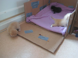 Hiekkalaatikko lienee sitten ensi viikon tai seuraavan juttuja, vähän katsellaan miten tuo syöminen lähtee. Jokaiselle pennulle on alustavasti kiinnostunut henkilö, joten saapi nähdä onko kaikki varattu ennen kun päästään edes lähelle luovutusikää. :D