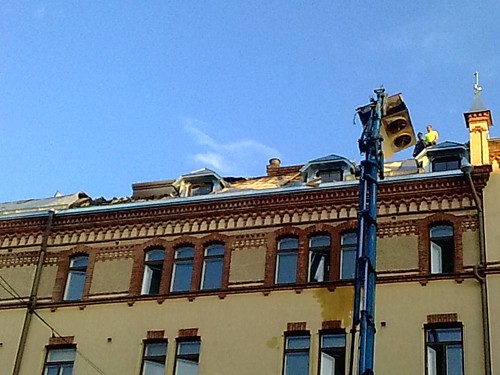 Katto on Hämeenkadun puolelta palasina ja jonkinlaista ilmastointihärpäkettä nostettiin pois. Keskustorin puolelta katto on ehjä ja osa liikkeistäkin näytti olevan avoinna.