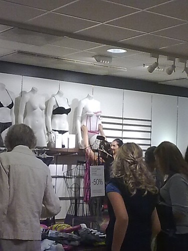Moni on varmasti huomannut, että h&m on yleensäkin hieman sotkuinen, tavaroita väärissä paikoissa ja vaatteet roikkuu miten sattuu, mutta tänään oli todella sekaista. Meikit, alusvaatteet, rasvat samoissa koreissa ja jopa vaatehyllyillä, mikään ei ollut omalla paikallaan. Puolet hyllyistä oli tyhjiä ja väkeä oli aivan sairaasti, pahempi kun Hullut Päivät. Jonottaessani kassalle huomasin yhden tytön repivän mallinukeilta alusvaatteet päältä, pian toinen tyttö teki saman toiselle nukelle. Kuvasi hyvin tunnelmaa. :D