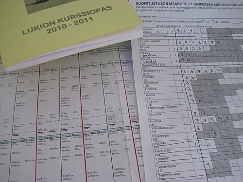 Minähän olen hieman yli kolmekymppinen, olen opiskellut nuorena lähihoitajaksi ja vuonna 2000 menin ensimmäisen kerran iltalukioon. Vaihdoin seuraavana syksynä päivälukioon jota kävin parisen vuotta. Sen jälkeen oli vuosien tauko kunnes vuonna 2006 palasin iltalukioon jota olen nyt käynyt säännöllisen epäsäännöllisesti. Välillä on ollut vuosia kun olen saanut vain yhden kurssin kasaan ja toisina vuosina on mennyt paremmin. Tälläkin tahdilla loppu on joskus edessä. Minun lukioni loppu häämöttää ensi vuoden keväässä. Tämän kevään matikan kirjoitukset oli jotenkin sellainen konkreettinen muistutus siitä, että tämä todella on kohta valmista. Vuosia olen "vain käynyt" lukiota ilman sen suurempaa tähtäintä milloin lakin saisin. Yo-kirjoitukset on ollut jotain jossain kaukana tulevaisuudessa. Vielä reilu vuosi sitten olisin naurahtanut (kauhusta) jos minulle olisi väitetty kirjoitusten olevan näin lähellä. Viime syksynä asiat vähän vahingossa menikin niin, että nyt ollaan tässä. On hullua katsella tuota paperia jossa näkyy käydyt kurssit arvosanoineen ja tajuta sen olevan kohta täynnä. Yhdentoista vuoden jälkeen on hienoisia vaikeuksia sisäistää tämän oikeasti pian loppuvan. Onneksi on vielä vuosi aikaa sulatella tätä totuutta ennen kun se lakki todella on päässä. :)